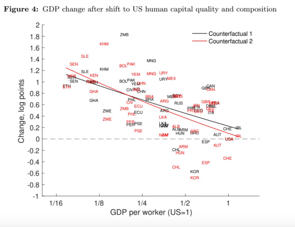 Our study’s counterfactual experiments yield striking results. For the poorest quintile of countries, a shift to US levels of human capital would double non-agricultural GDP and the white-collar employment rate, while decreasing the wages of white-collar workers relative to blue-collar workers by 30%.